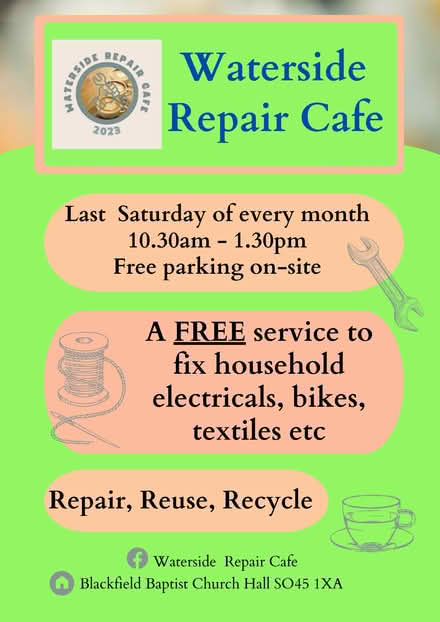Located just outside of the New Forest, Waterside Repair Cafe aims to reduce waste and support local people to repair over disposal. Linking to a local food waste programme, refreshments are provided from supermarket waste. This also allows us to offer food that would otherwise go to waste to our Repair Cafe visitors.