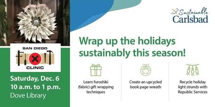 ### Event description Join the City of Carlsbad’s Sustainable Materials Management team for a free Fixit Clinic and repair event. Get help fixing small appliances, electronics, bikes, clothing, and more. We’ve all become too…